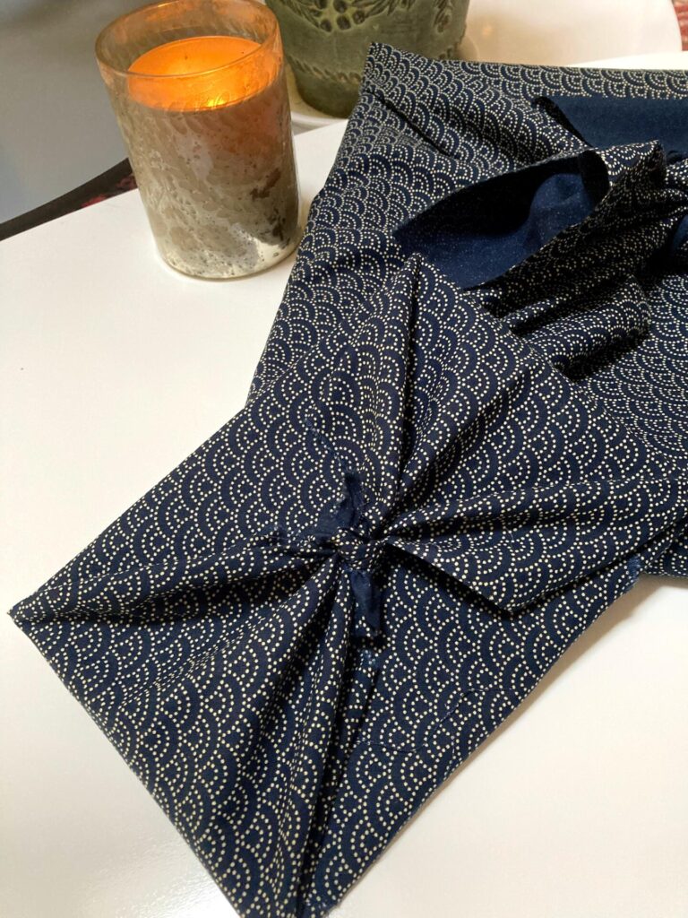 Le Furoshiki est un tissu qui sert à emballer les cadeaux au Japon. Ce tissu quand vous offrez un cadeau est votre propriété, vous le récupérez, sauf si vous avez envie de l’offrir. Il peut permettre d’initier cette forme d’emballage très écologique auprès des personnes chères à qui vous offrez des cadeaux.