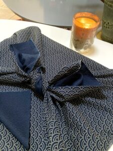 Le Furoshiki est un tissu qui sert à emballer les cadeaux au Japon. Ce tissu quand vous offrez un cadeau est votre propriété, vous le récupérez, sauf si vous avez envie de l’offrir. Il peut permettre d’initier cette forme d’emballage très écologique auprès des personnes chères à qui vous offrez des cadeaux.