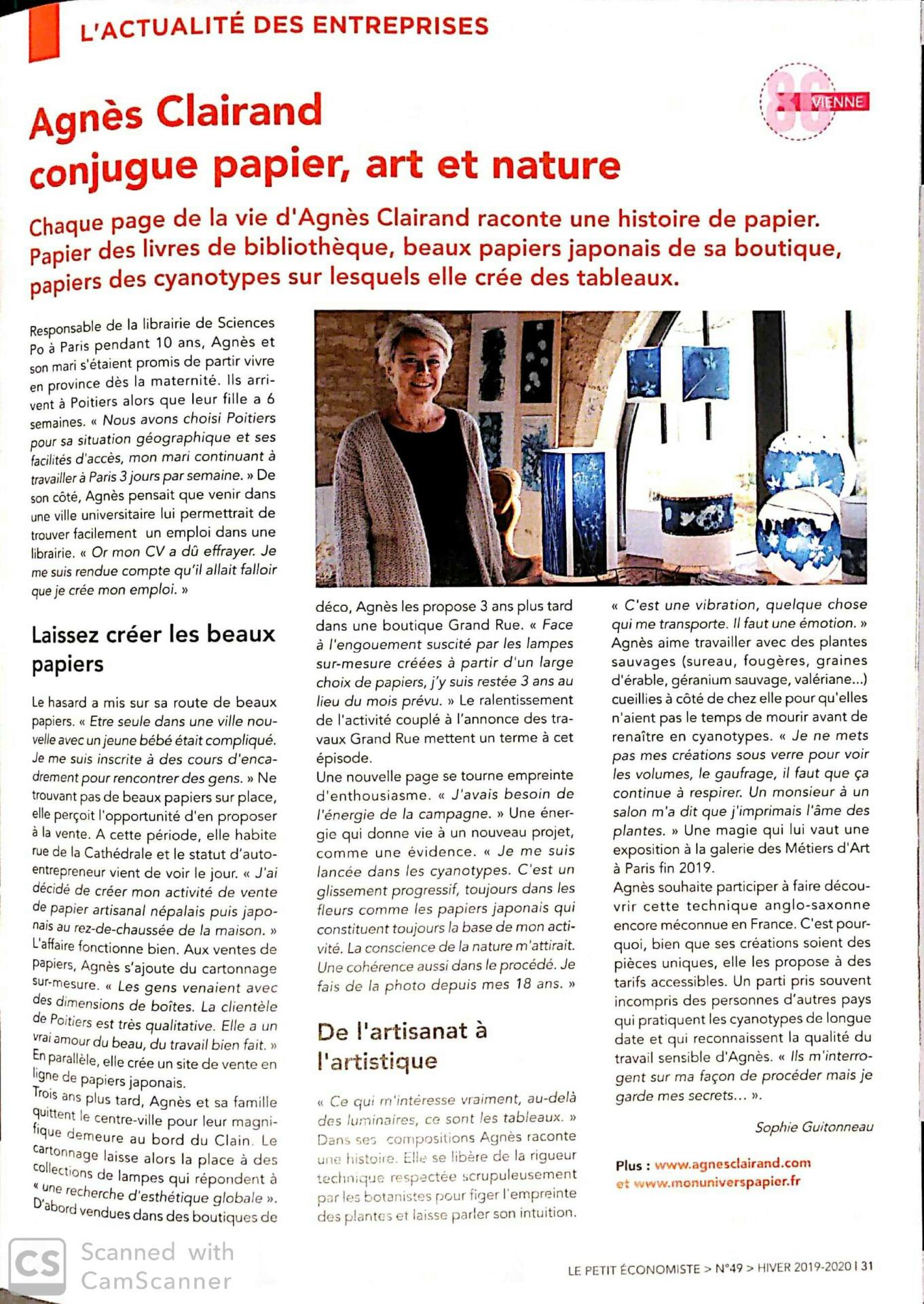 J’ai beaucoup de chance, car régulièrement des journalistes me contactent pour un article dans la presse régionale et/ou spécialisée. Cette année c’est le Petit économiste qui a voulu parler de mon activité. Un très bel article rédigé par Sophie guitonneau paru juste avant Noël comme pour résumer l’année, la finir en beauté et résumer les 10 années qui viennent de s’écouler au milieu du papier japonais ! Merci Sophie !