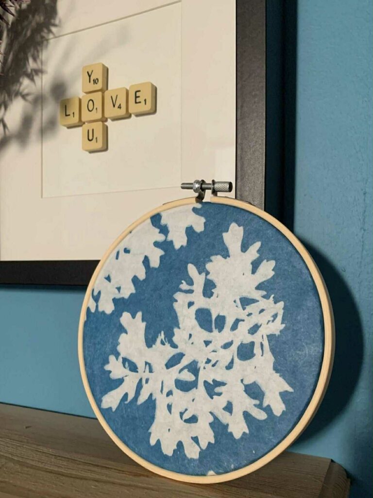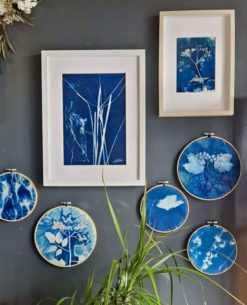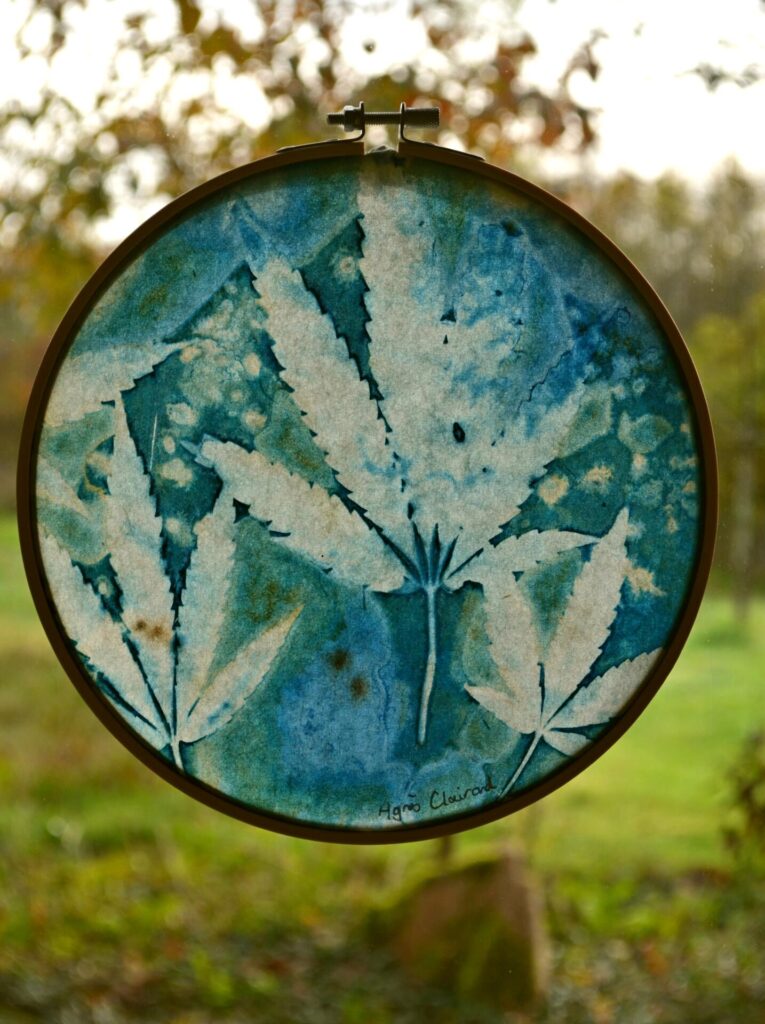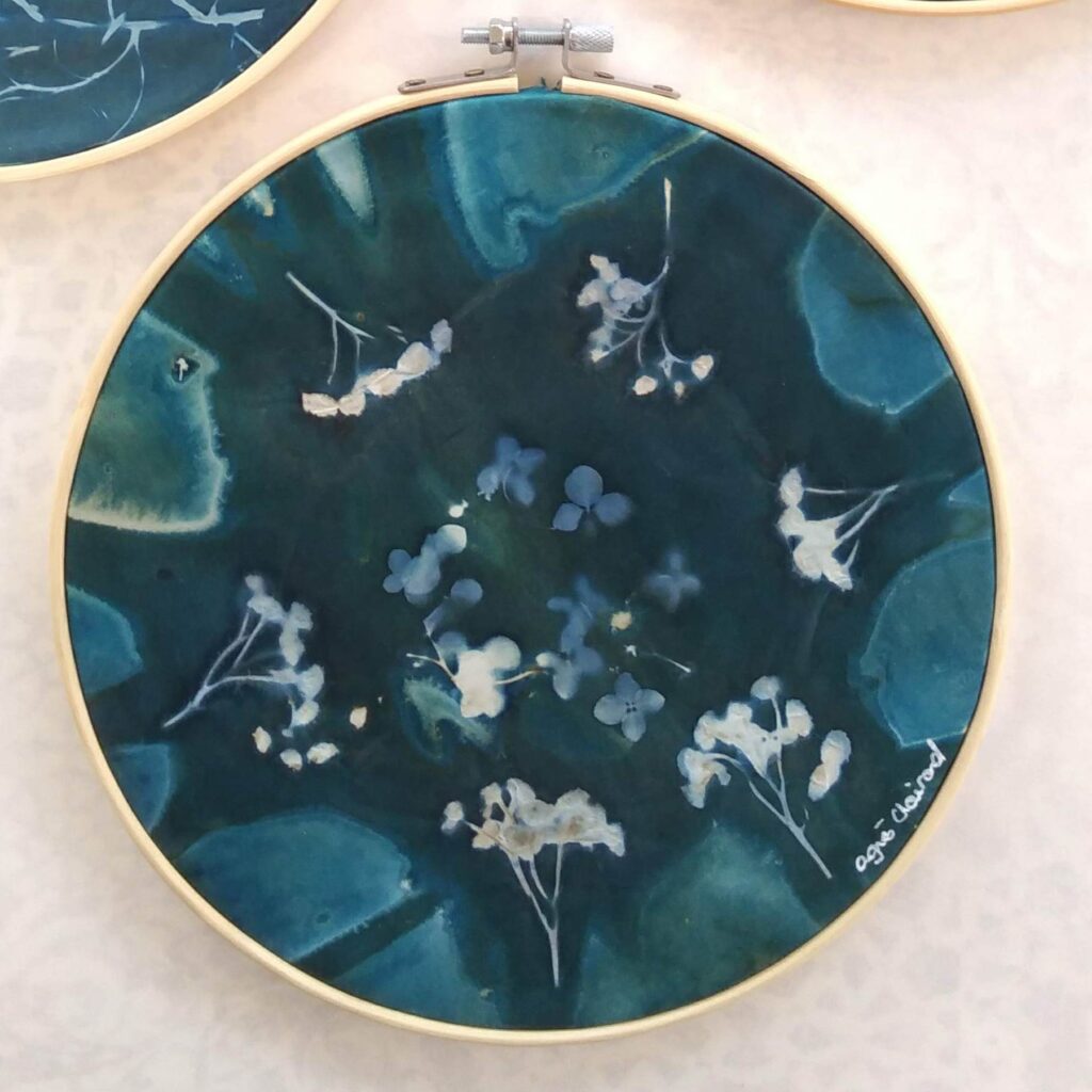 L’invitation est de faire une composition de fleurs que vous aurez cueillies avec le groupe, de réaliser un cyanotype à partir de cette composition puis d’encadrer le cyanotype  dans un cadre à broder pour l’accrocher au mûr ou l’installer à contre jour d’une fenêtre.