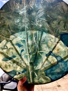 Je suis un canal entre la terre et le ciel entre le monde des vivants et le monde subtil. Le tambour intègre en lui les 4 points cardinaux, les 4 règnes et les 4 éléments plus l’éther, il intègre la médecine de tous ces règnes et il permet d’y relier votre coeur. La vie me propose aujourd’hui de réaliser ces tambours. Je n’ai pas choisi, j’ai écouté mon coeur. J’accueille cette mission avec la sagesse à la hauteur de la mission. Je suis emplie de gratitude car j’en connais toute la responsabilité. Je suis aussi pleine de gratitude envers moi-même. Je chemine depuis plus de 30 ans pour aller à la rencontre de ma lumière originelle. Je n’ai pas besoin de faire Saint-Jacques de Compostelle !! Si aujourd’hui la vie me propose la réalisation de ces tambours c’est que j’ai en moi cette lumière et cet alignement qui me permet de vous apporter sa médecine. Le cyanotype que je réalise est unique, il apporte la médecine du règne végétal de façon encore plus présente. Il apporte la médecine du monde subtil dans la matière.